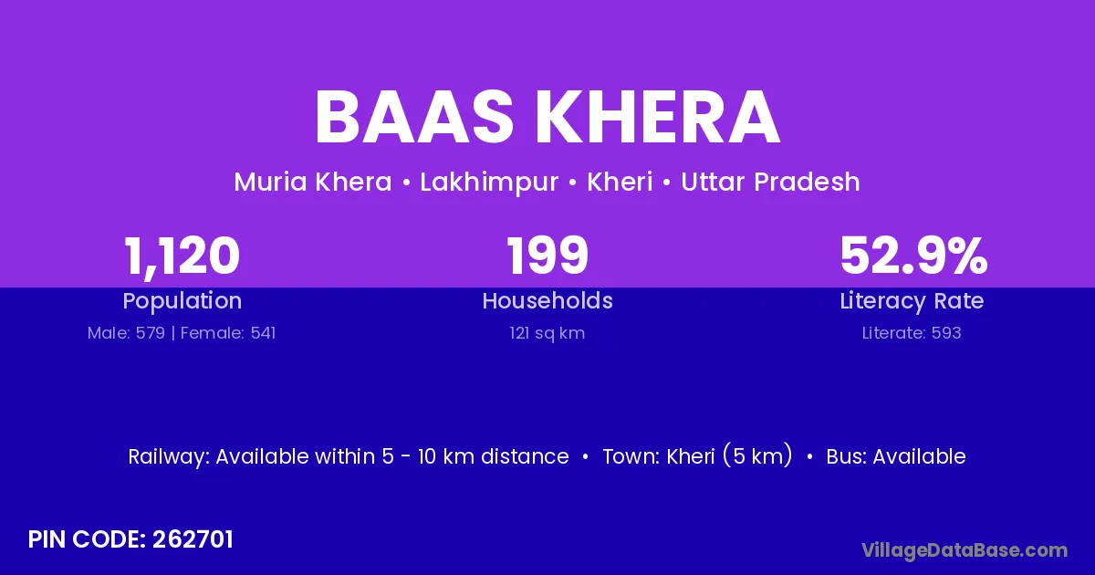 Baas Khera village has a total population of 1,120 people, of which 579 are males and 541 are females.