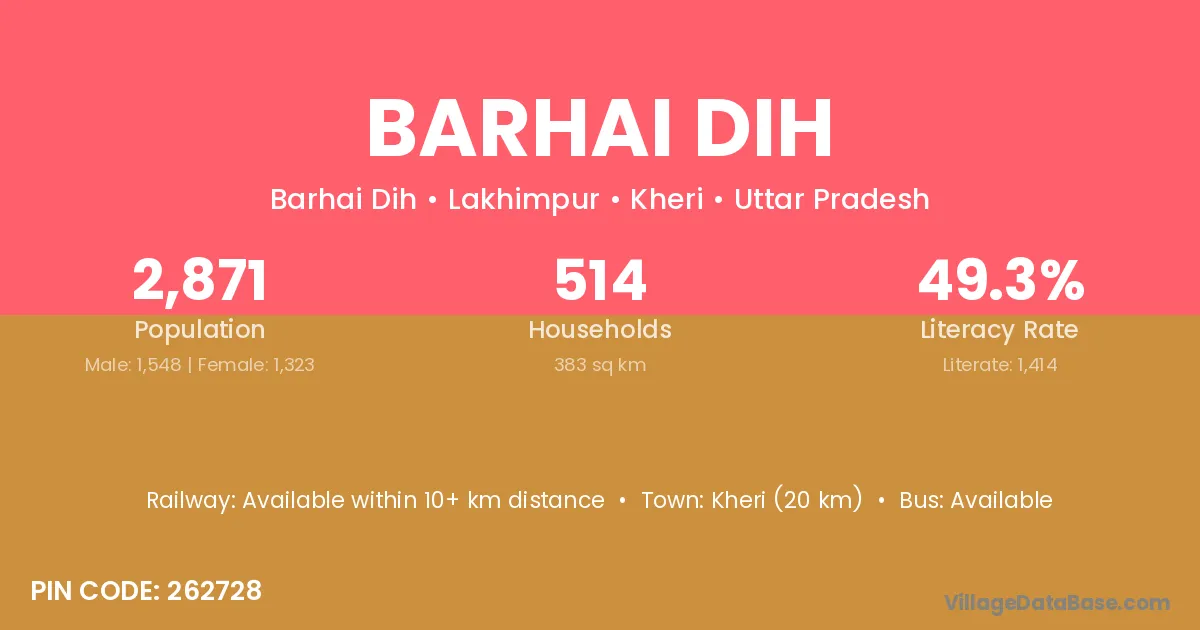 Kheri (20 km) is the nearest town to Barhai Dih village for major economic activities and is located approximately 20 km away.