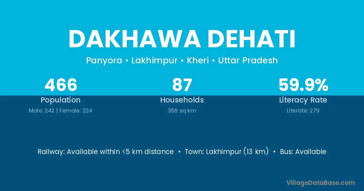 Lakhimpur (13 km) is the nearest town to Dakhawa Dehati village for major economic activities and is located approximately 13 km away.