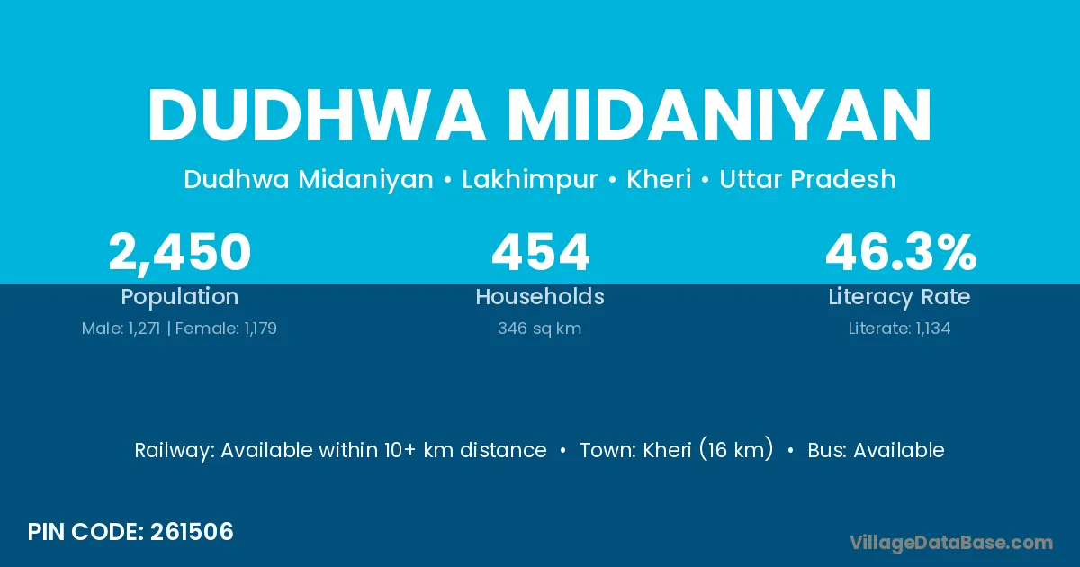 Kheri (16 km) is the nearest town to Dudhwa Midaniyan village for major economic activities and is located approximately 16 km away.