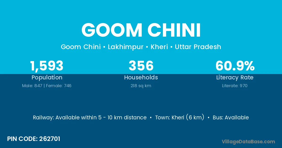 Goom Chini village has a total population of 1,593 people, of which 847 are males and 746 are females.