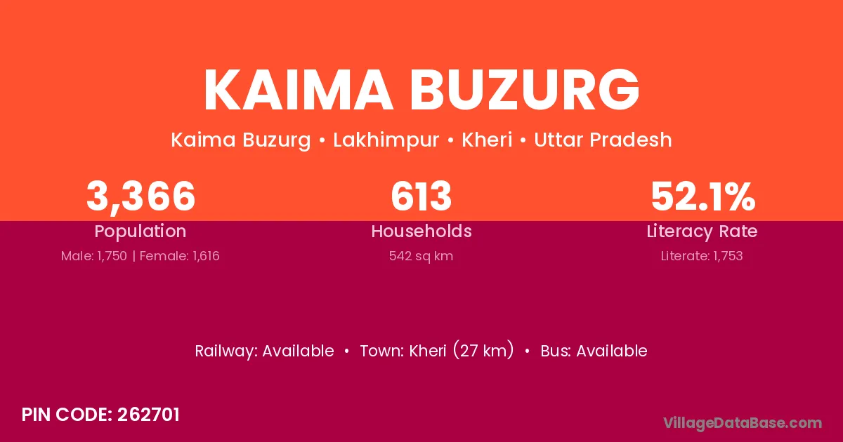 Kheri (27 km) is the nearest town to Kaima Buzurg village for major economic activities and is located approximately 27 km away.