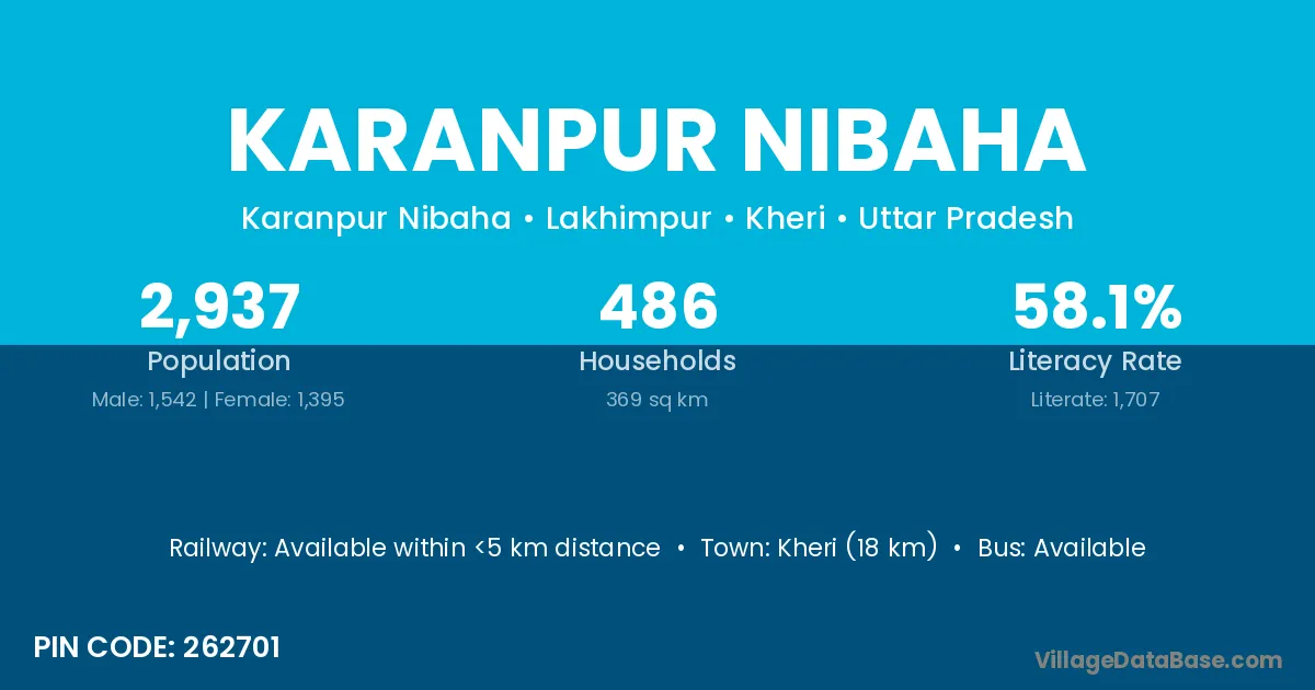 Kheri (18 km) is the nearest town to Karanpur Nibaha village for major economic activities and is located approximately 18 km away.