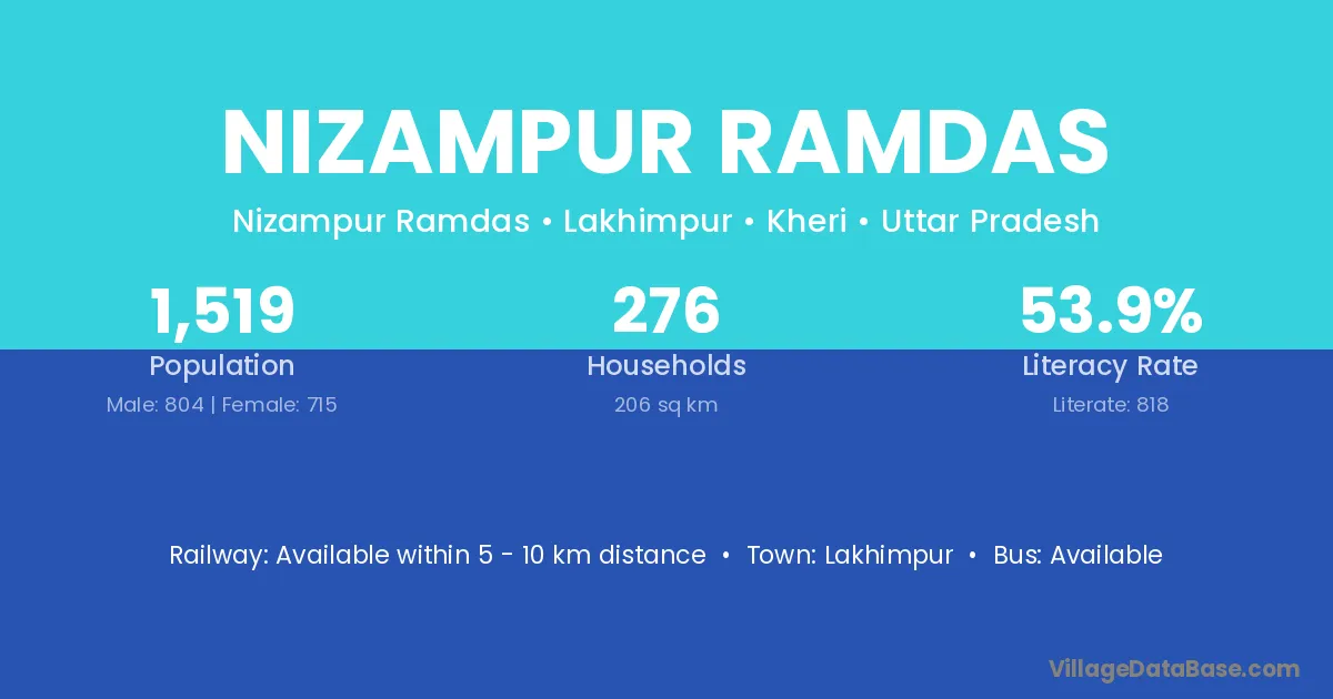 Nizampur Ramdas village has a total population of 1,519 people, of which 804 are males and 715 are females.