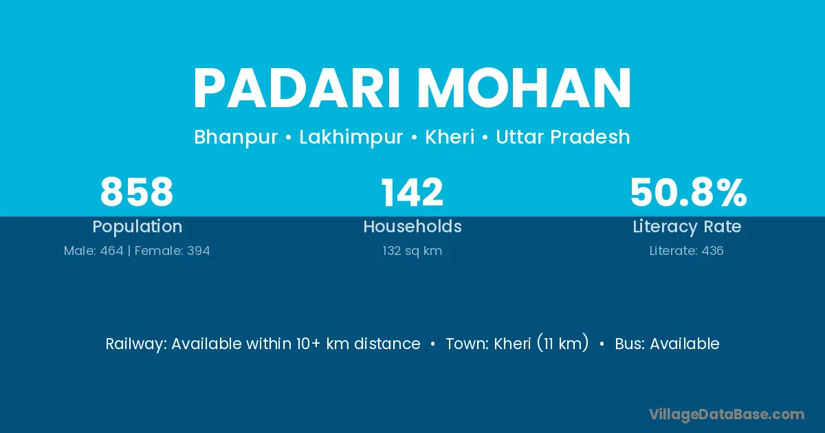 Kheri (11 km) is the nearest town to Padari Mohan village for major economic activities and is located approximately 11 km away.