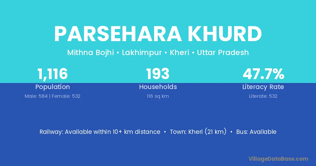 Kheri (21 km) is the nearest town to Parsehara Khurd village for major economic activities and is located approximately 21 km away.