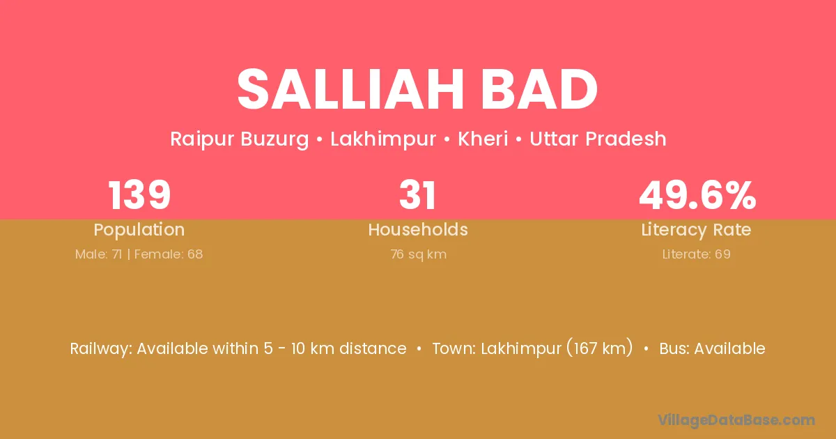 Lakhimpur (167 km) is the nearest town to Salliah Bad village for major economic activities and is located approximately 167 km away.