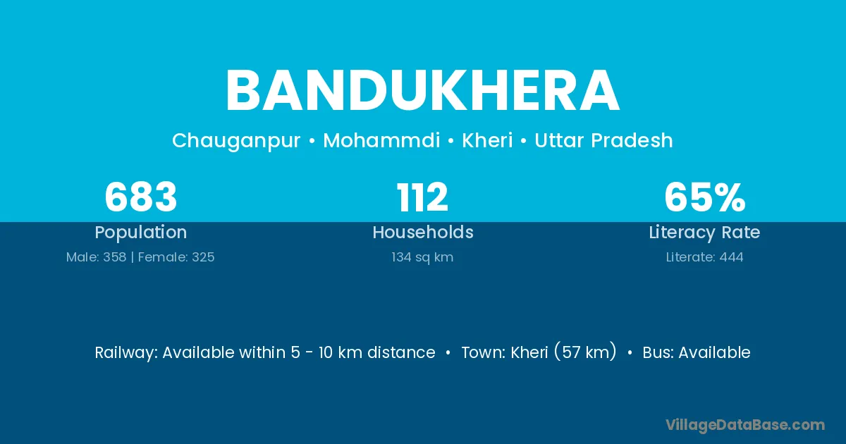 Kheri (57 km) is the nearest town to Bandukhera village for major economic activities and is located approximately 57 km away.