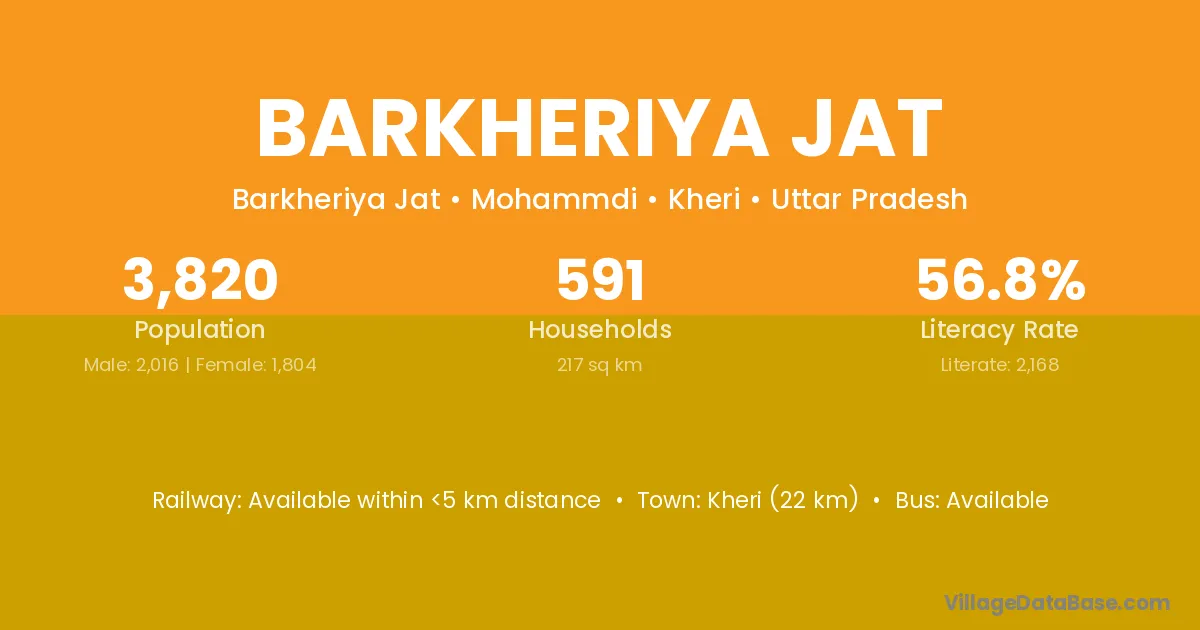 Kheri (22 km) is the nearest town to Barkheriya Jat village for major economic activities and is located approximately 22 km away.
