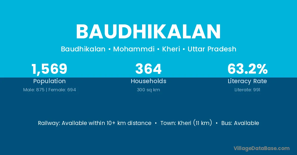 Kheri (11 km) is the nearest town to Baudhikalan village for major economic activities and is located approximately 11 km away.