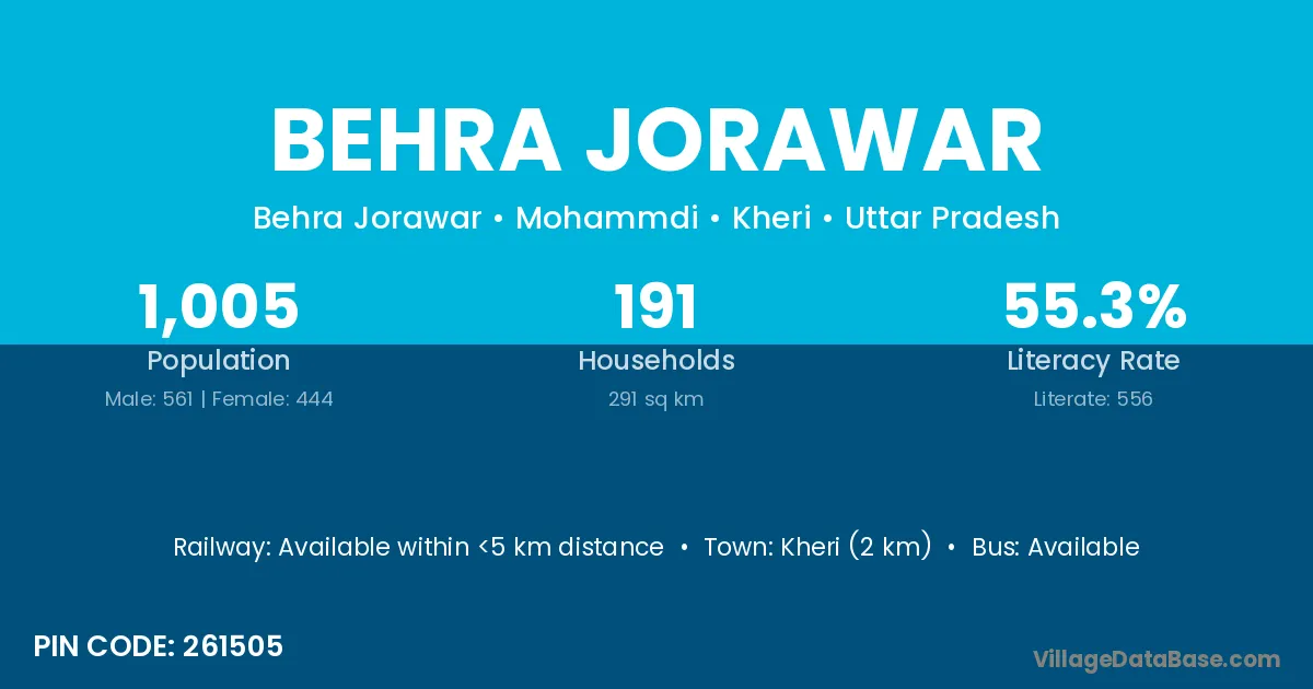 Kheri (2 km) is the nearest town to Behra Jorawar village for major economic activities and is located approximately 2 km away.