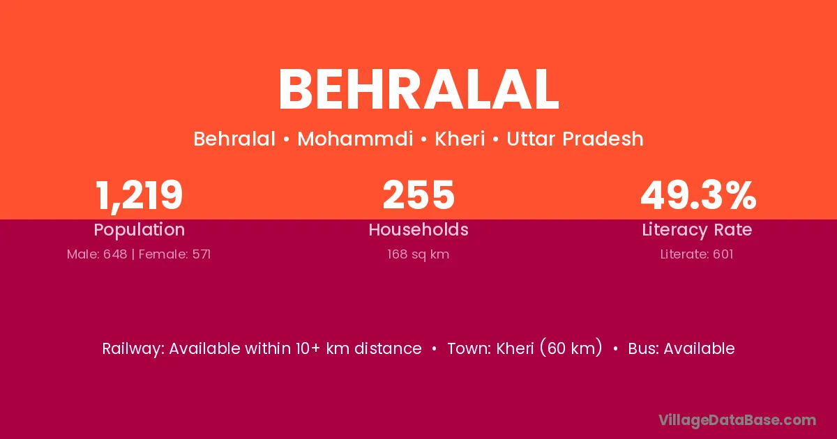 Kheri (60 km) is the nearest town to Behralal village for major economic activities and is located approximately 60 km away.