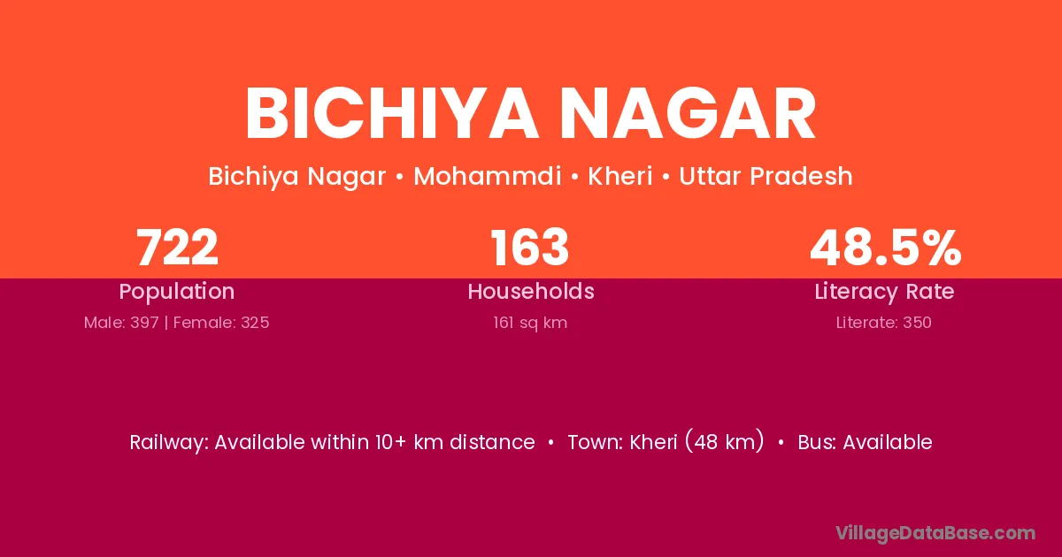 Kheri (48 km) is the nearest town to Bichiya Nagar village for major economic activities and is located approximately 48 km away.