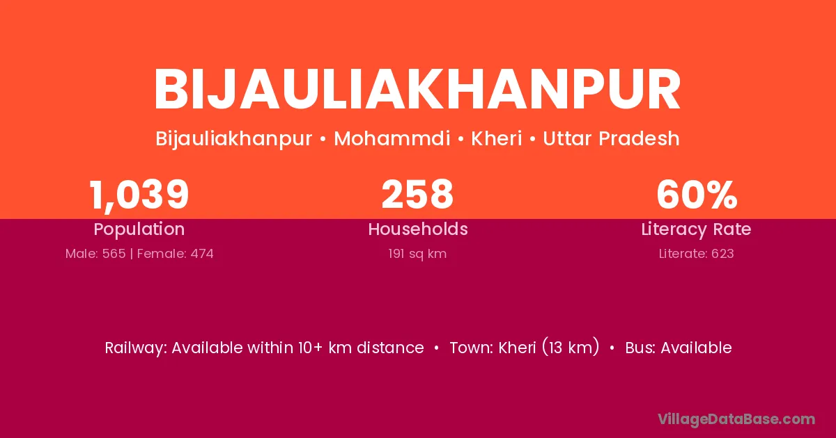 Kheri (13 km) is the nearest town to Bijauliakhanpur village for major economic activities and is located approximately 13 km away.