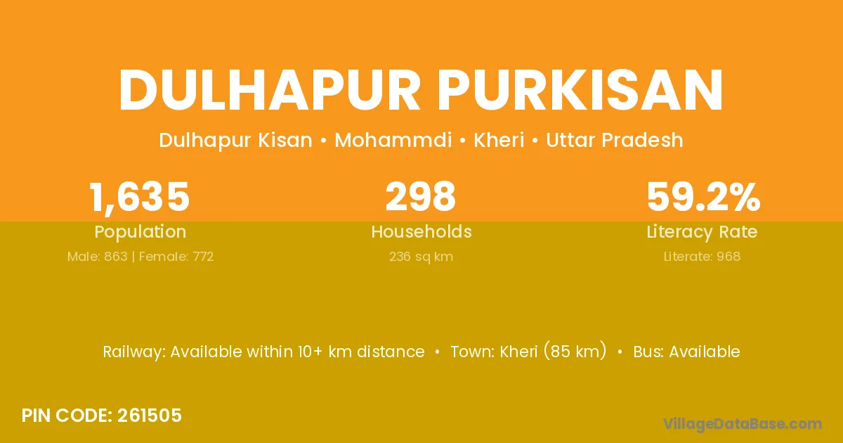 Kheri (85 km) is the nearest town to Dulhapur Purkisan village for major economic activities and is located approximately 85 km away.