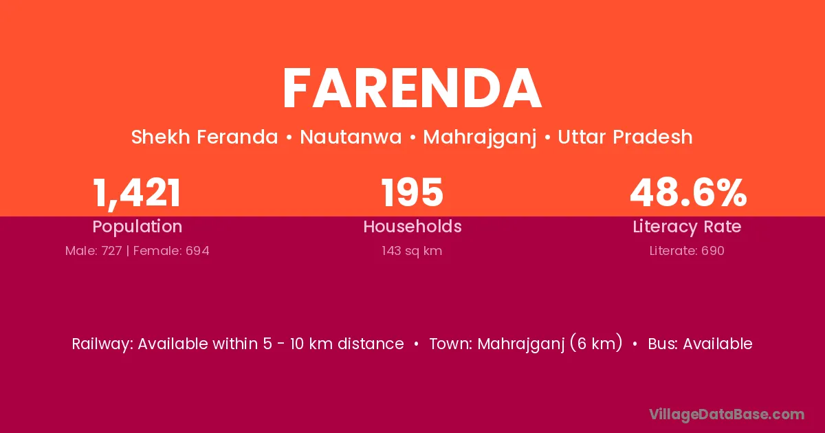 The literacy rate of Farenda village is 58.85%. Male literacy stands at 67.27% and female literacy at 48.92%.
