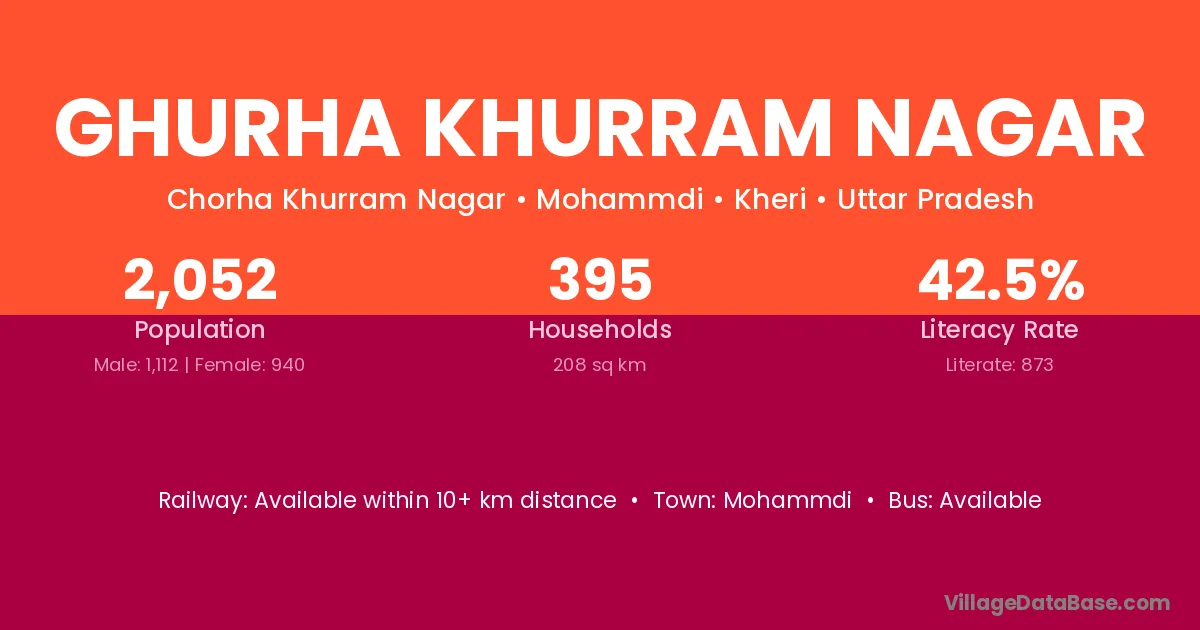 Ghurha Khurram Nagar village has a total population of 2,052 people, of which 1,112 are males and 940 are females.