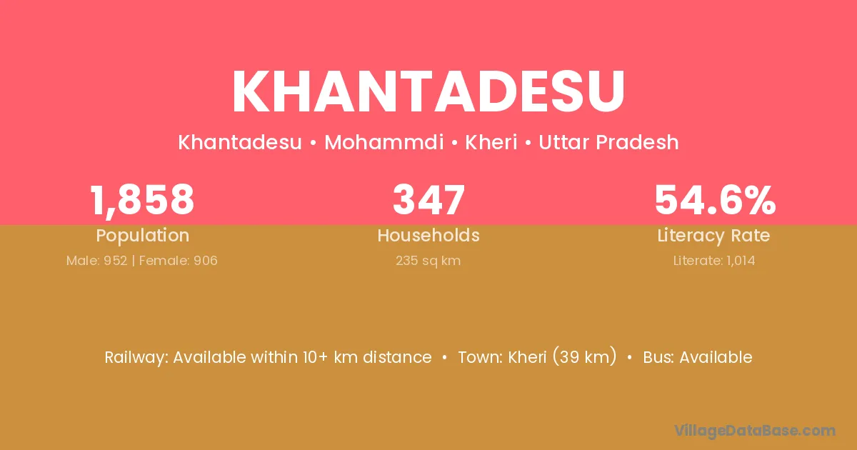 Khantadesu village has a total population of 1,858 people, of which 952 are males and 906 are females.