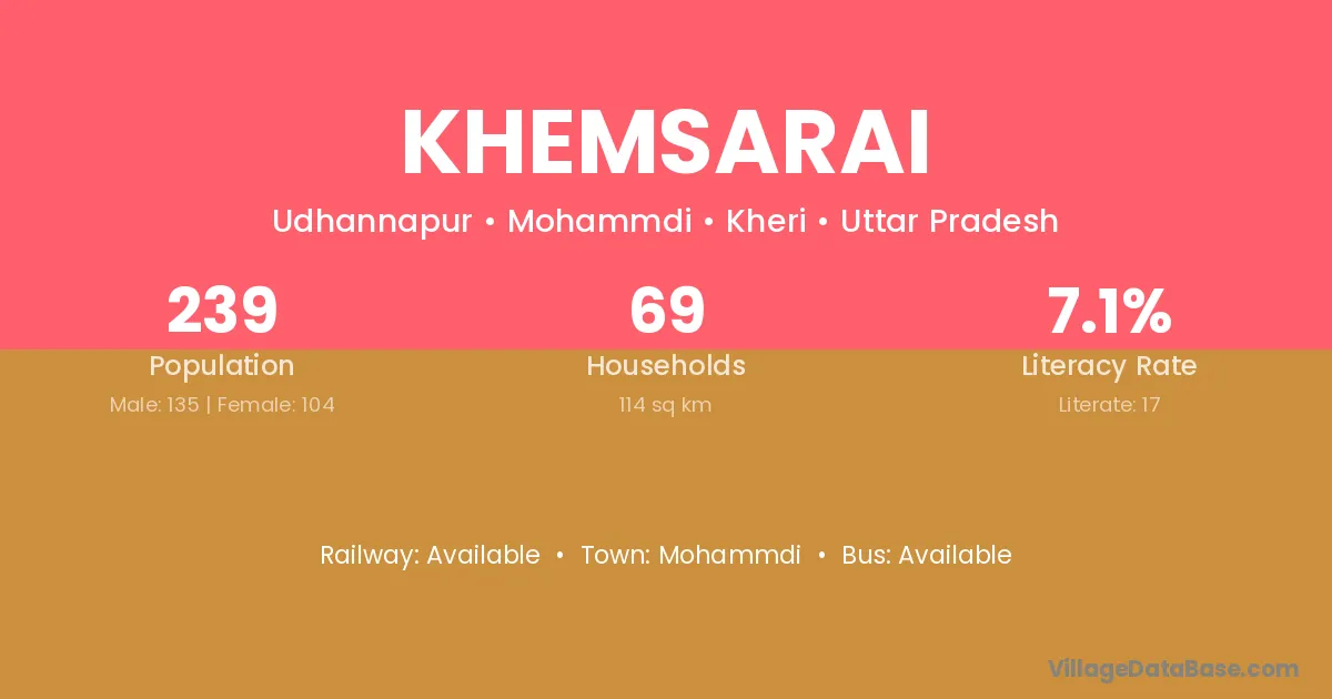 Khemsarai village has a total population of 239 people, of which 135 are males and 104 are females.