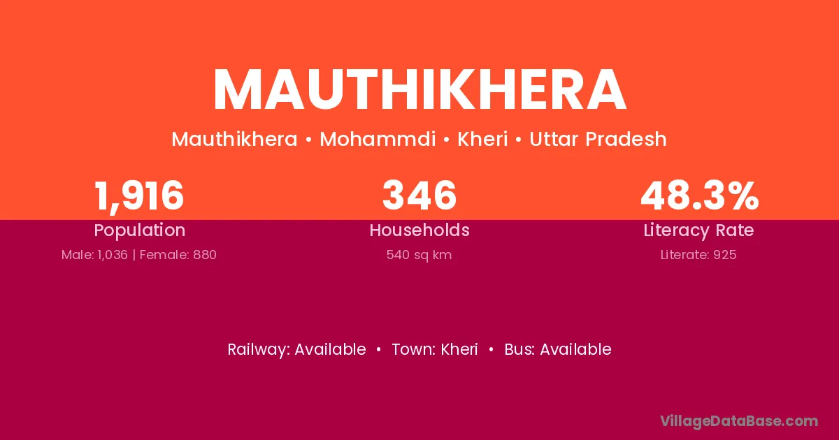 Mauthikhera village has a total population of 1,916 people, of which 1,036 are males and 880 are females.