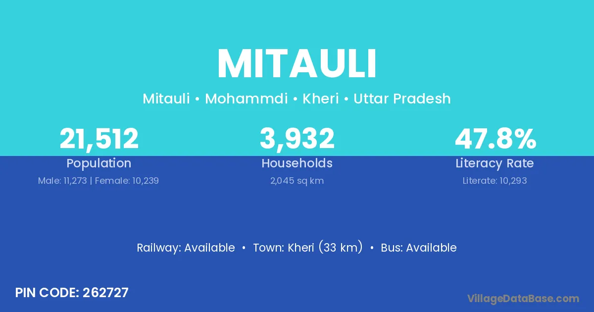 Kheri (33 km) is the nearest town to Mitauli village for major economic activities and is located approximately 33 km away.