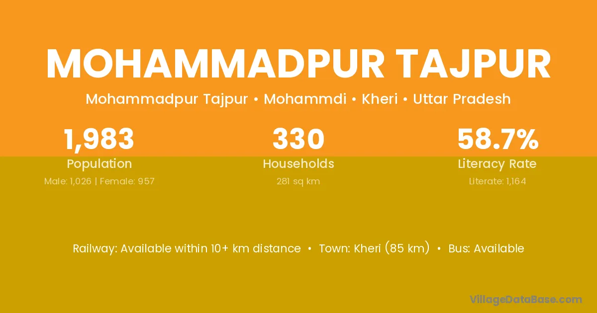 Kheri (85 km) is the nearest town to Mohammadpur Tajpur village for major economic activities and is located approximately 85 km away.