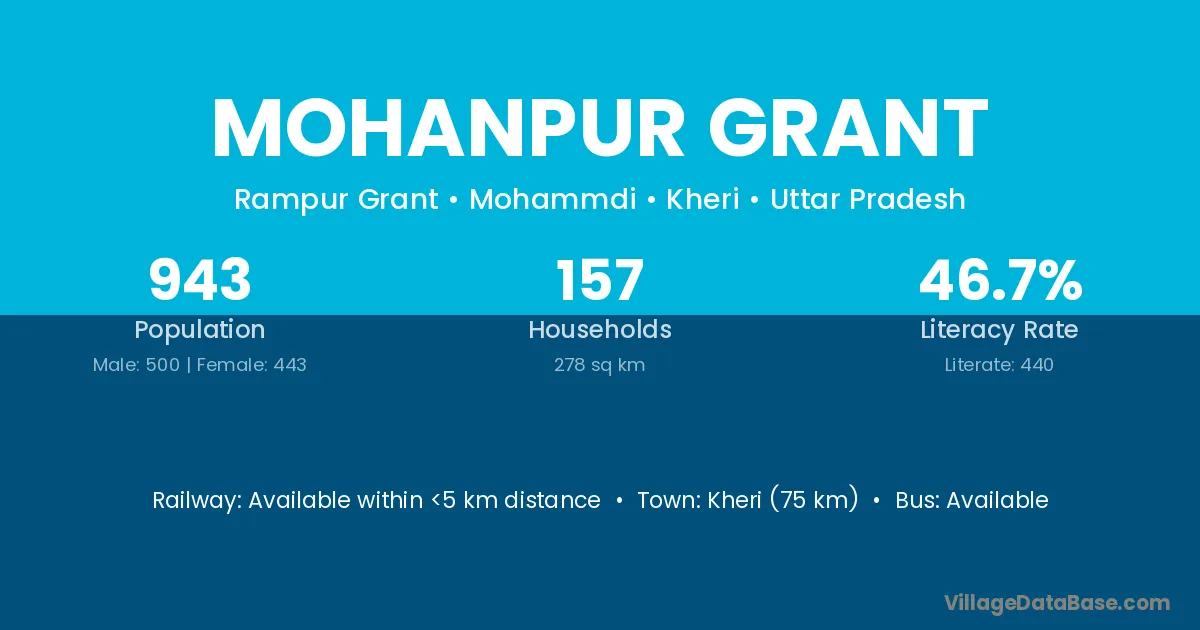 Kheri (75 km) is the nearest town to Mohanpur Grant village for major economic activities and is located approximately 75 km away.