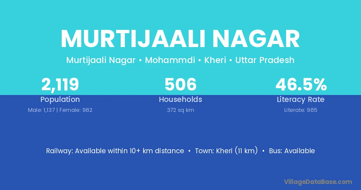 Kheri (11 km) is the nearest town to Murtijaali Nagar village for major economic activities and is located approximately 11 km away.
