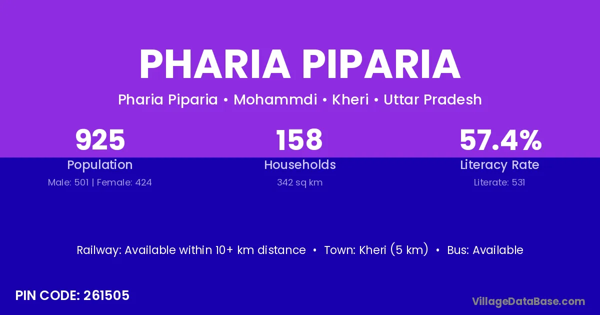 Kheri (5 km) is the nearest town to Pharia Piparia village for major economic activities and is located approximately 5 km away.