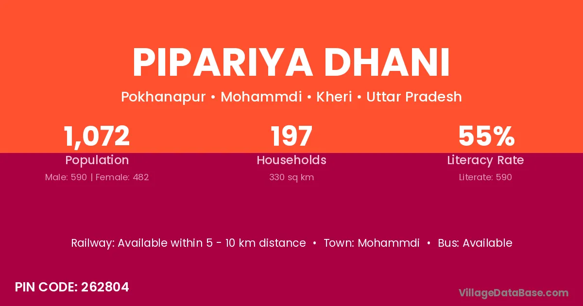 Pipariya Dhani village has a total population of 1,072 people, of which 590 are males and 482 are females.