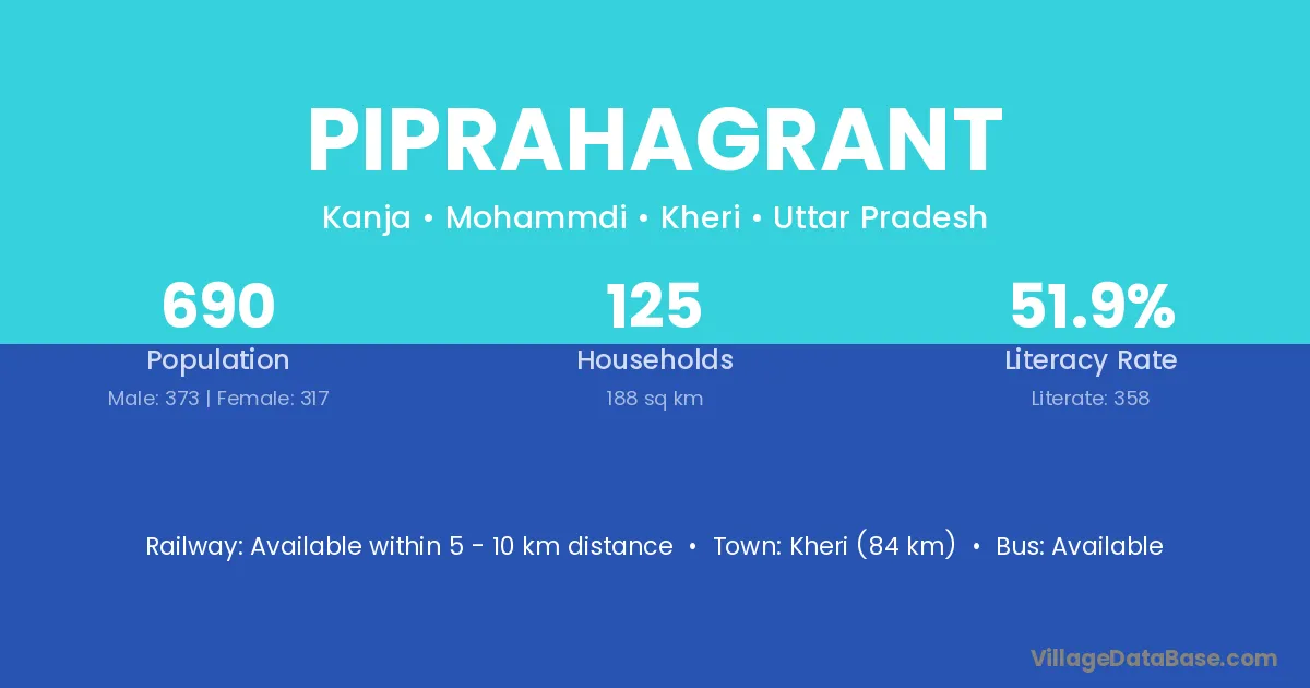 Kheri (84 km) is the nearest town to Piprahagrant village for major economic activities and is located approximately 84 km away.