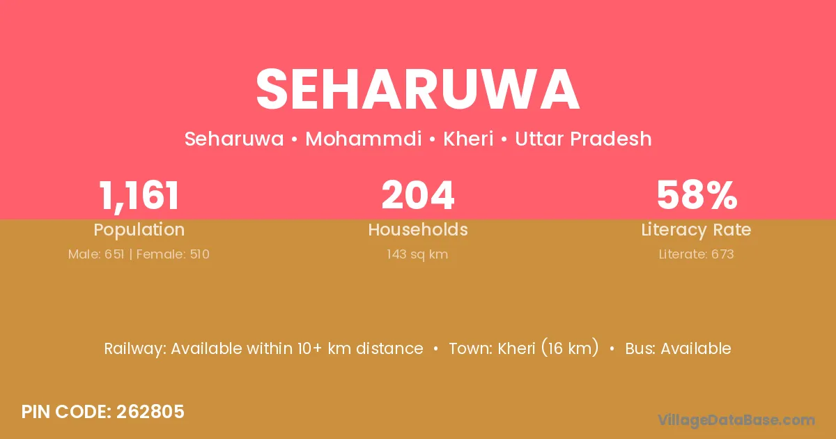 Seharuwa village has a total population of 1,161 people, of which 651 are males and 510 are females.
