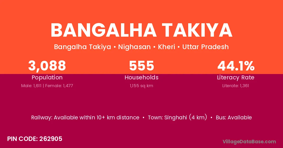 Bangalha Takiya village has a total population of 3,088 people, of which 1,611 are males and 1,477 are females.