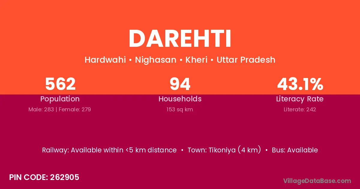 Darehti village has a total population of 562 people, of which 283 are males and 279 are females.