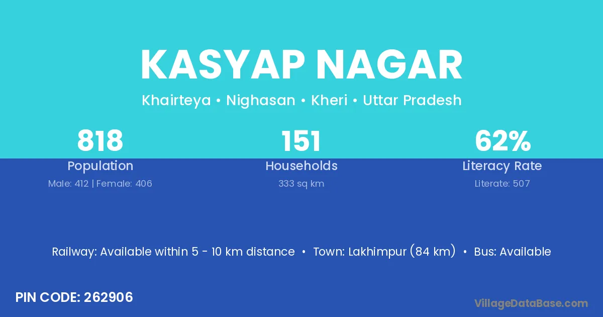 Lakhimpur (84 km) is the nearest town to Kasyap Nagar village for major economic activities and is located approximately 84 km away.