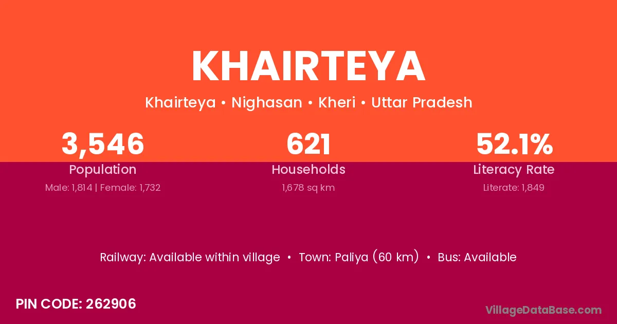 Khairteya village has a total population of 3,546 people, of which 1,814 are males and 1,732 are females.