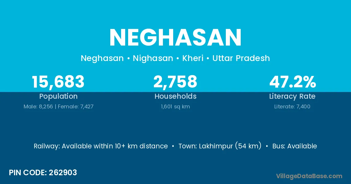Lakhimpur (54 km) is the nearest town to Neghasan village for major economic activities and is located approximately 54 km away.