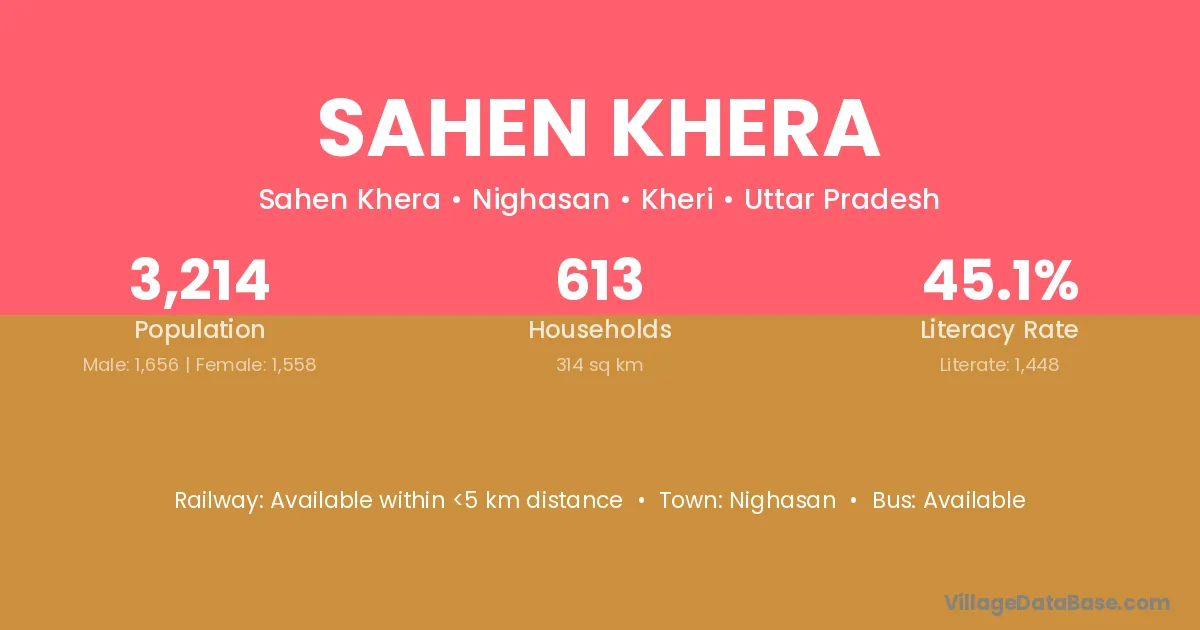 Sahen Khera village has a total population of 3,214 people, of which 1,656 are males and 1,558 are females.