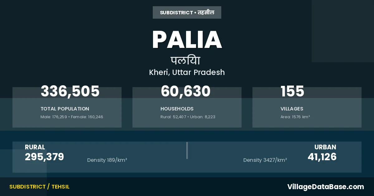 According to the 2011 census The total area of Palia Tehsil is 1576 km², with a population of 336505 people. The population density is 214 inhabitants per square kilometre, and there are approximately 60630 houses in the sub district.