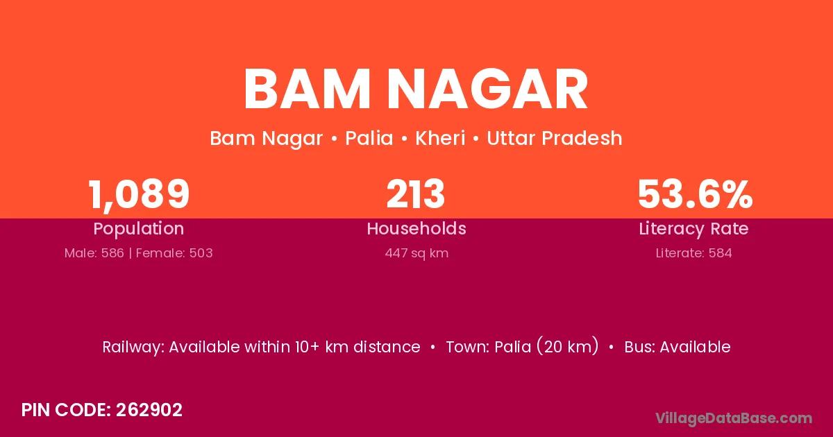 Palia (20 km) is the nearest town to Bam Nagar village for major economic activities and is located approximately 20 km away.