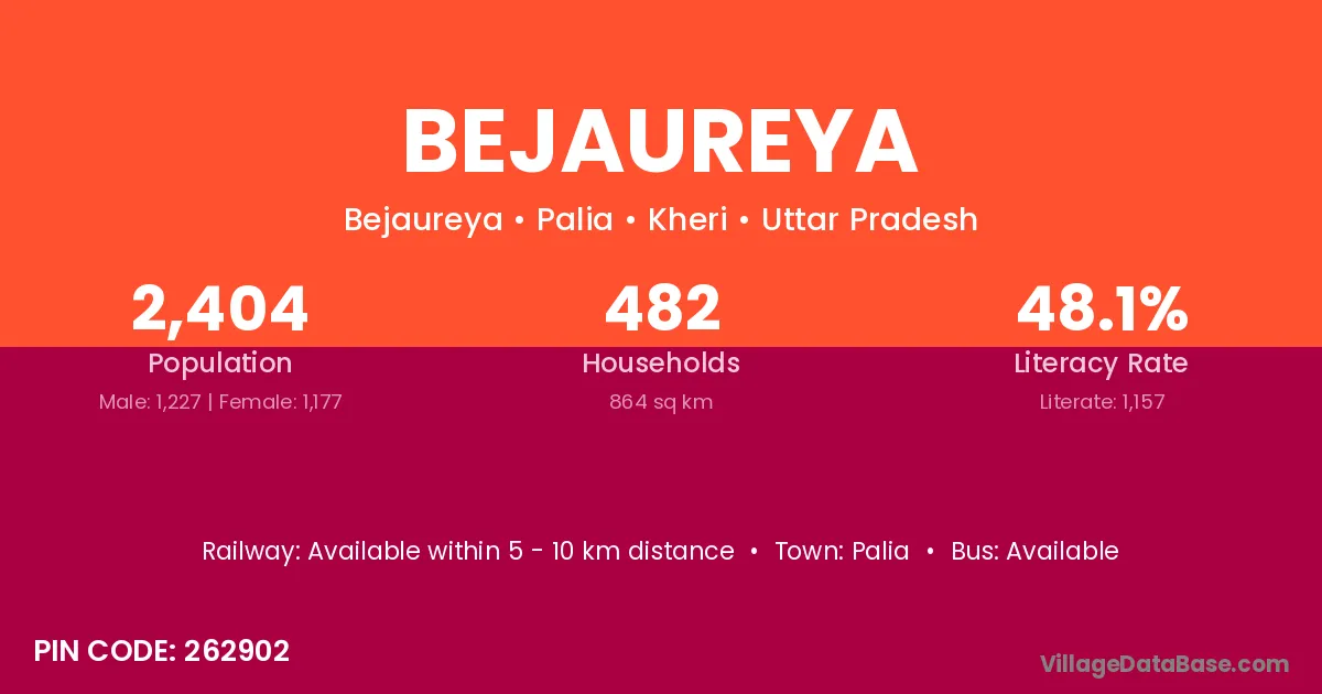 Bejaureya village has a total population of 2,404 people, of which 1,227 are males and 1,177 are females.