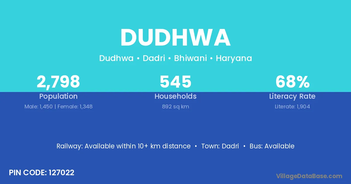 The literacy rate of Dudhwa village is 63.45%. Male literacy stands at 72.92% and female literacy at 50.48%.