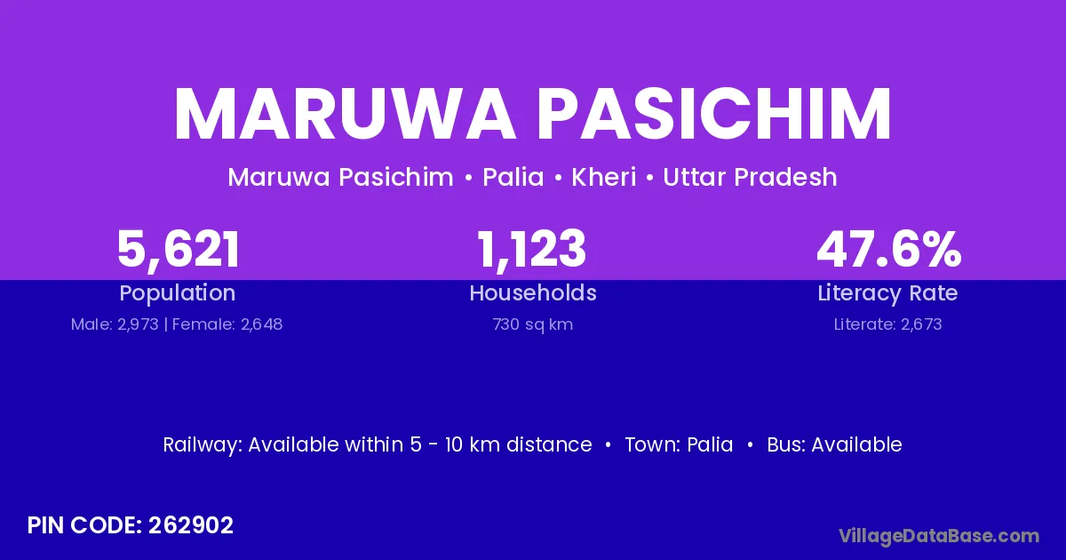 Maruwa Pasichim village has a total population of 5,621 people, of which 2,973 are males and 2,648 are females.