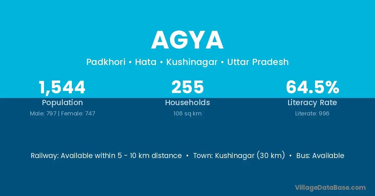 Kushinagar (30 km) is the nearest town to Agya village for major economic activities and is located approximately 30 km away.