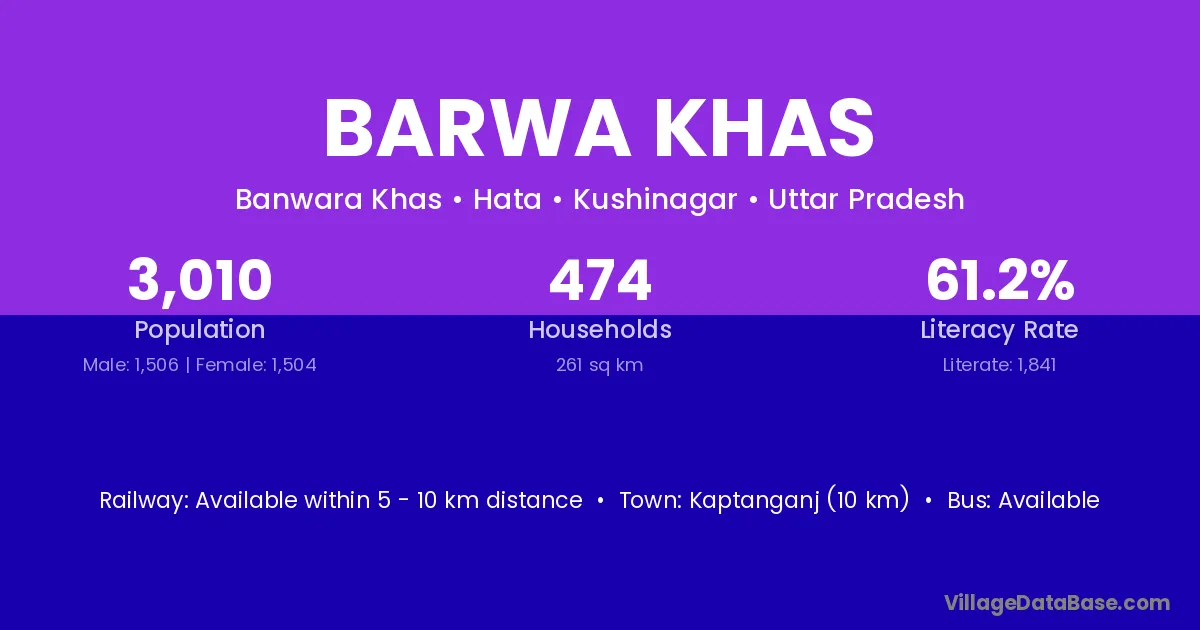 Kaptanganj (10 km) is the nearest town to Barwa Khas village for major economic activities and is located approximately 10 km away.