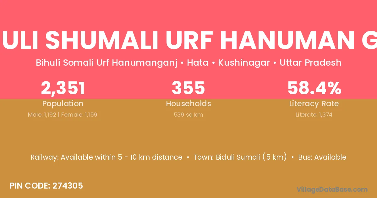 Bihuli Shumali Urf Hanuman Gan village has a total population of 2,351 people, of which 1,192 are males and 1,159 are females.