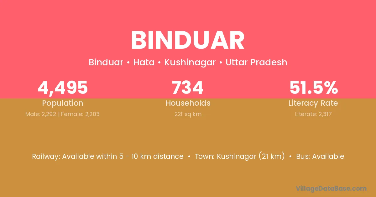Kushinagar (21 km) is the nearest town to Binduar village for major economic activities and is located approximately 21 km away.