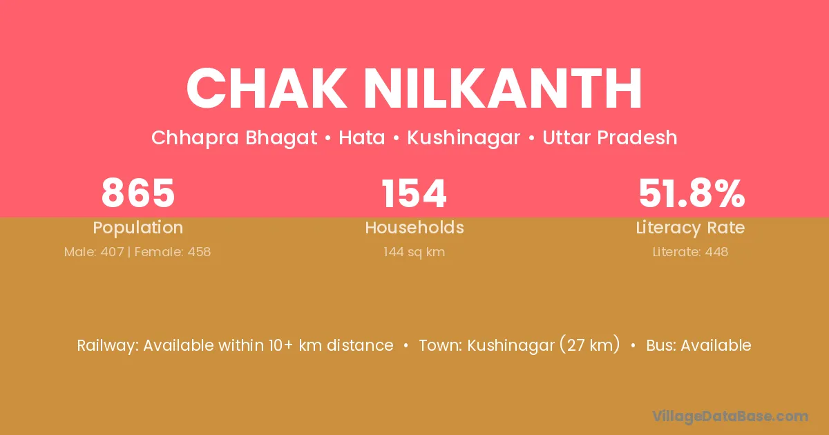 Kushinagar (27 km) is the nearest town to Chak Nilkanth village for major economic activities and is located approximately 27 km away.