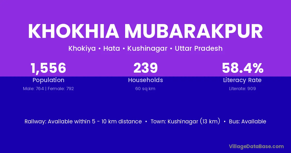 Kushinagar (13 km) is the nearest town to Khokhia Mubarakpur village for major economic activities and is located approximately 13 km away.