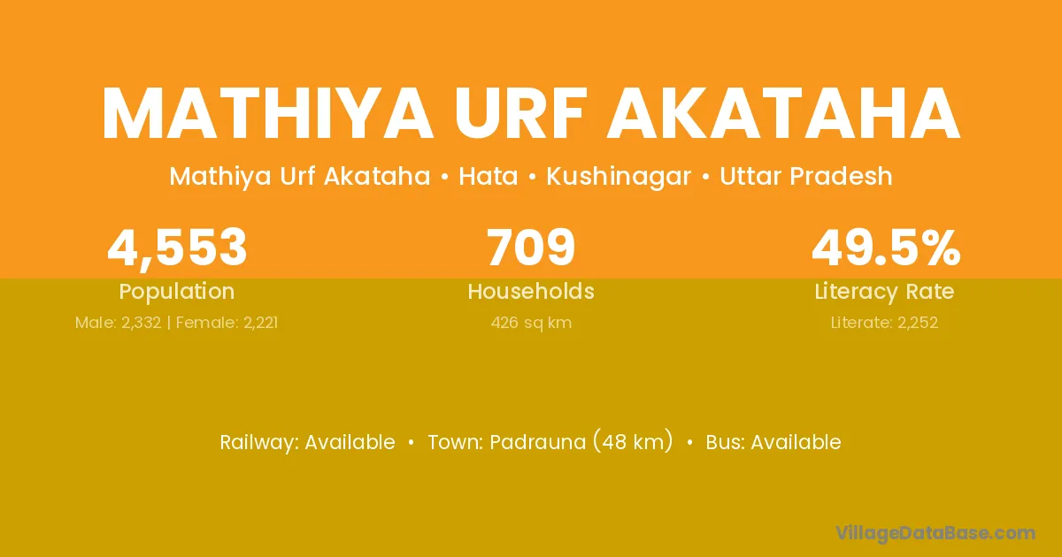 Padrauna (48 km) is the nearest town to Mathiya Urf Akataha village for major economic activities and is located approximately 48 km away.